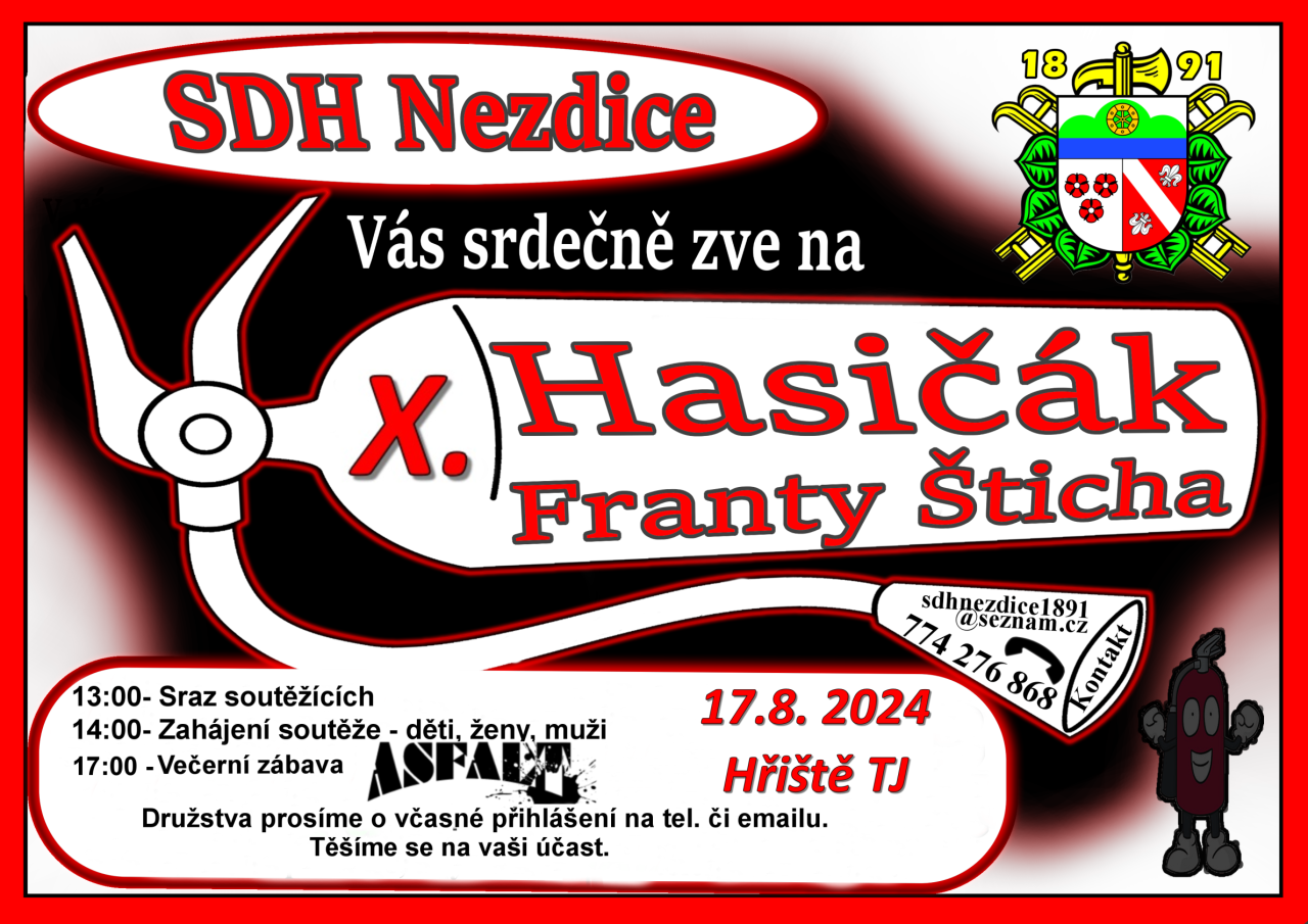 Pozvánka na X. ročník nezdického Hasičáku Franty Šticha - 17.8. 2024