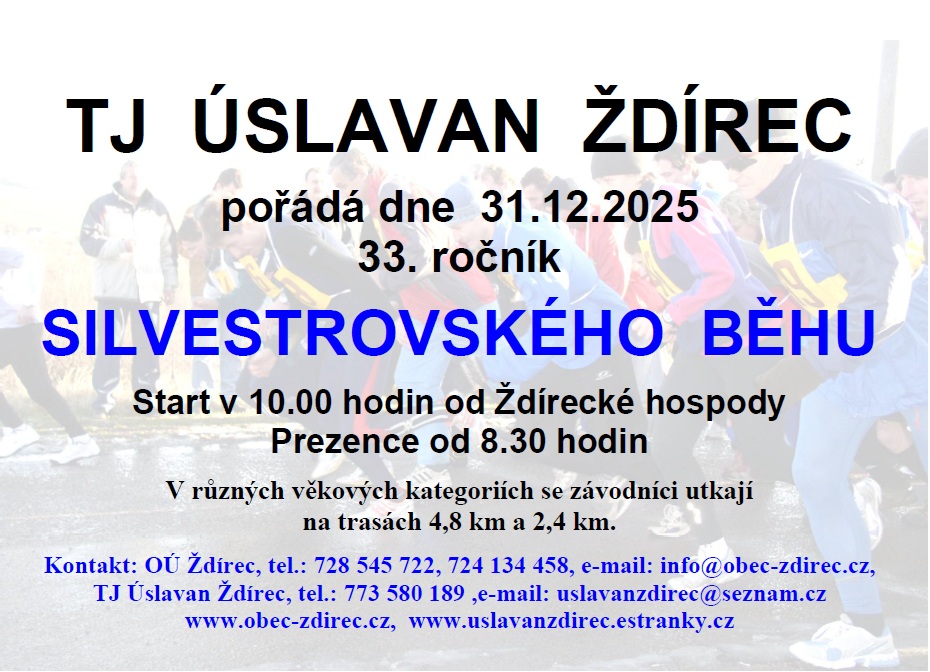 TJ Úslavan Ždírec pořádá 33. ročník Silvestrovského běhu, který se uskuteční 31. prosince 2025. Závodníci se utkají v různých věkových kategoriích na trasách o délkách 4,8 km a 2,4 km. Start závodu je naplánován na 10:00 hodin od Ždírecké hospody, přičemž prezence začne již od 8:30 hodin. Všichni účastníci jsou srdečně zváni k účasti na této tradiční akci.