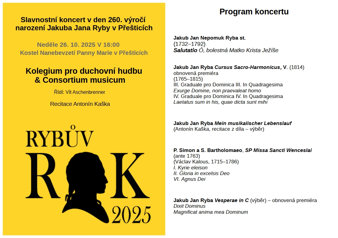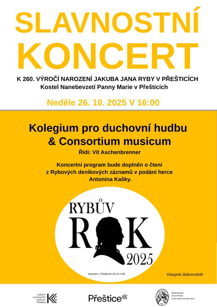 Zveme vás na koncert k 260. výročí narození Jakuba Jana Ryby, který se uskuteční v Kostele Nanebevzetí Panny Marie v Přešticích. Program bude řídit Vít Aschenbrenner a doplní ho čtení z Rybových deníkových záznamů v podání herce Antonína Kašky. Přijďte oslavit tuto významnou událost s námi.