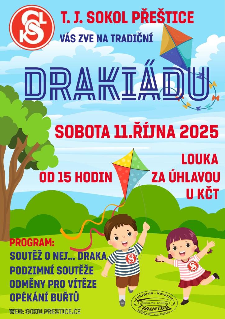 T. J. Sokol Přeštice vás srdečně zve na tradiční drakiádu, která se uskuteční v sobotu 11. října 2025. Přijďte si užít podzimní soutěže, které přinesou mnoho zábavy a soutěžení. Pro vítěze jsou připraveny odměny a také si můžete pochutnat na opékaných buřtech. Těšíme se na vaši účast a společně strávený čas.