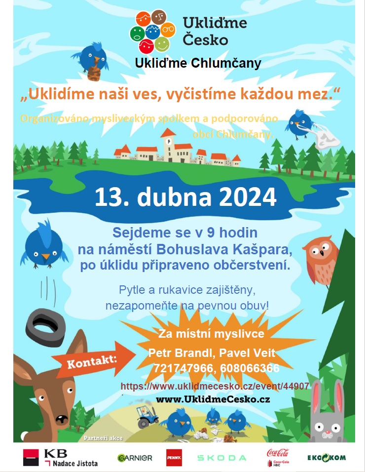 Ukliďme Česko - V sobotu 13.4.2024 sraz v 9:00 hod. na Náměstí B. Kašpara v Chlumčanech.